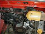 Dalším krokem je vyřezání otvoru v předním čele a kapotě, upevnění předního chladiče a stavba chladičové stěny. Já zvolil chladičovou stěnu z hliníkového plechu tl 2mm, upevněnou 12 šrouby přes gumové těsnění k držákům (L-profil) nanýtovaným a přitmeleným k podběhům. Lze však samozřejmě chladičovou stěnu vevařit, problémem však bude případná demontáž trubek, která počítá s možností vyjmutí chladičové stěny. Chladičovou stěnu na horní hraně vhodně vytvarujeme tak, aby dosedala ke kapotě a opatříme vhodným těsněním (těsnění kufru Š120). Před chladičem je umístěn "usměrňovač vzduchu", který plní funkci držáku mřížky a zamezuje vzduchu k proudění mimo plochu chladiče. Celý usměrňovač je vyroben z hliníkového plechu a uchycen čtyřmi šrouby k přednímu čelu. Po připojení chladiče k trubkám lze celý systém "napustit" vodou a odvzdušnit. V mém voze ještě přibyla nutnost otočit hrdlo nádrže do kufru - to je vyřešeno zkráceným hrdlem Š120 a otvorem v chladičové stěně. Celek pak v kufru vypadá takto, detail připojení hadic k termostatu a zadnímu chladiči je zde.