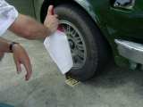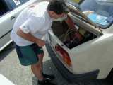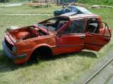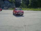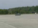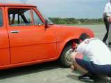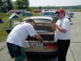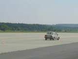 Po závodech to většina z nás díky horku zabalila, ale Vlado ještě zůstal a blbnul na ploše s hundrtkou. Výsledkem byl ohnutý disk a olej vytékající z poloosy. Při pokusech o 180° otočku se guma žvejkla a auto tak naklonilo, že vzal diskem o zem. No ale zajeli jsme do opuštěného hangáru, kde byl příjemný chládek a kolo jsme vyměnili.
