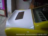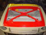 Takže předek je více méně hotov. Po peripetiích s plechovou přední kapotou, kdy na mě při broušení vykoukl sádrovej trpaslík v podobě tun kitu a haldy koroze, která na mě vykoukla na obvyklých místech. Jsem se okamžitě rozhodl použít laminátový potah přední kapoty. Odpáral jsem vrchní plech a ponechanou výztuhu jsem pečlivě obrousil, natřel odrezovačem a nastříkal základem. Po té přišla na řadu vrchní barva a to červenná Rallye 8180, přeci kvůli tomu, že se lakýra tak dobře nedostane s pistolí pod mřížku ala 130RS :oD No a tím jsem vlastně prozradil budoucí barvu vozu. Proč červená rallye, no protože přidá erku alespoň 20 "kobyl" navrch a potom ten název "rallye" mě dostal :oD