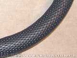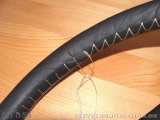 Takto připravený potah opět natáhnu na věnec volantu a pak sešívám kraje k sobě tak, že kde z jednoho kraje vypíchnu jehlou, tam do druhého vpíchnu a zas kde vylezu, tak hned naproti vpíchnu do toho prvního a takhle jednoduše, leč zas až taková legranda to neni, sešijete celý věnec dokola. Je dobré opatřit si na to zahnutou ševcovskou jehlu a kleštičky na vytahování. I když se trochu zlepšuju, tak mě osobně tato sešívací operace trvá několik hodin.