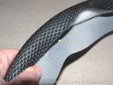 U tohoto volantu jsem se snažil o původní vzhled, tudíš se nebudu snažit znásobovat tloušťku věnce a protože už nemám slabinkej molitan, použiju syntetický valelín. Změřim si přibližně všechny parametry věnce, pak si podle toho střihnu pruh vatelínu a na věnec ho lepím, aby v budoucnu necestoval nebo neumožnil cestovat potahu na něm.