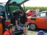 14:35 jsme po splnění nejrůznějších úkolů v Čáslavi kde je polední pauza před poslední etapou.Dáváme poslední ůkol chlupatou čáru a jdeme obědvat. Při jídle se s ostatníma posádkama dělíme o nevšední zážitky předcházejících etap. Zároveň probíhá anketa o nejhezší a nejstrašnější vozidlo srazu - vyhlášení bude až v neděli