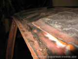 Střecha byla za mnou, tak se mohlo pokračovat uvnitř vozu. I tam po vybroušení až na plech vykouklo pár děr. Nezbývalo než je zavařit. Sice vnitřek není ještě úplně hotov vrhnul jsem se na kufr.