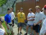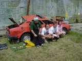 Po závodech to většina z nás díky horku zabalila, ale Vlado ještě zůstal a blbnul na ploše s hundrtkou. Výsledkem byl ohnutý disk a olej vytékající z poloosy. Při pokusech o 180° otočku se guma žvejkla a auto tak naklonilo, že vzal diskem o zem. No ale zajeli jsme do opuštěného hangáru, kde byl příjemný chládek a kolo jsme vyměnili.