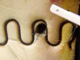 Tyto díry vedou skrz pěnovou výplň sedadla až na předek čalounění. V dírách je vidět drát, který „tvaruje sedadlo“ . Vašim úkolem je drát přitáhnout co nejvíce k sobě. Čím více drát přitáhnete tím více vystoupí bočnice. Já drát zachytil háčkem, přitáhl ho a přivázal vázacím drátkem k pružinám sedačky.