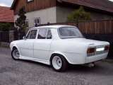 Tak jak se Jirka dostal ke své bílé kryse? Má rád motorky a tuningovaná auta. Pomalu ale jistě mu vlézalo do hlavy, ze si sežene MBargo a nebo hundrtku a bude z ní letadlo. Od kamaráda sehnal kilárnu doslova za pár korun. Koupil ji v červenci a teď po pátých Mimoňských válkách (kde byl) v Květnu ještě není všem pracím konec. První úpravy nastaly v zavaření klik a nádechů v zadních blatnících.Byl namontován odskakovací zámek.Pak prišly na řadu opravdu dlouhé hodiny kitování které jsme Jirkovi zpříjemňovali svým zíráním, jak se s tím p(s)ere. Další přisel na řadu motor Favorit s utočeným setrvákem který nahradil dosavadní 120. Pak přišla řada na palubku, která byla nakonec asi 3x předělávaná, než dostala nějaký ten jiný vzhled. Pak Jirka udělal převařované disky z origo Škodováckých. Na tom nechal 165 gumy, takže vzhled docela zajímavý. Prišlo i na tlumiče kterým byly upýchnuty pružiny. V iteriéru byly zkoušeny kombinace sedaček, které nakonec zkončily u dvou skořepin. Polstrování je taky Jirkovo originální. Volant je od MOMO. Úchopku na qaltovce si Jirka dělal ve vzhledu pístu. Teploměr a hodiny jsou od VDO. Jirku v autě chrání (snad) jeho vlastní vymontovatelný rám. Prahy jsou po menší úpravě, protože byly určeny pro 105-Rapid. Na přední kapotu jsme vymysleli výdech tepla pro náporový chladič z (tuším TDi) Octavie. Za přepážkou se ukrývá topení z Favorita. Úpravama podstoupila i světla. Zadní i přední byla překopána na čirá. Zadní čirá však nahradila světla z Opla, která tam jsou hezčí než ta čirá. V lízátku jsou namontované i čiré blinkry. V zadu bylo upraveno místo pro SPZ. Nárazníky nejsou, seč by to bylo lepší, ale Jirka si starosti nedělá. Vepředu je udělané oko pro odtah. Převařovaná kola byla nahrazena okruhovými elektrony Ford s obutím Toyo 175/60. Bylo taky přidané hřebenové řízení z Favorita. Favoriťácký motor nahradil řádný karburátorový sériový agregát Toyota 1.6 16V, který má k dispozici 5q z Rapida.