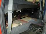 Odřežeme celou podsadu - klín zadních sedaček do roviny - zároveň s tunelem a prahy. Mezi tunel a prahy navaříme nebo nanýtujeme jekl 30-40 x 15 aby se zpevnila podlahová část v místě zadních sedaček a bylo kam uchytit zbylý plech pod zadními sedačkami ( mezistěna mezi kabinou a prostorem pod zadními sedačkami ). Do této výztuhy nebo před tuto výztuhu ( podle toho jak jsme udělali držák na sedačce ) uděláme protikus na držák sedačky. Zde si může každý vymyslit co je mu libo. Buď kolík - čep na sedadle, který zajede do díry v tom jeklu, nebo podobné řešení jak je na fotu - zobáček se zasouvá do podkovy přidělané na výztuze - tato je schovaná pod čalouněním...