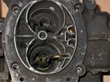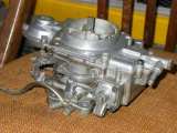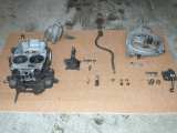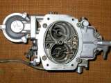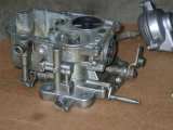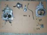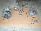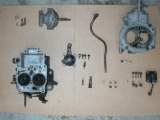 Následuje rozebrání karburátoru. Je dobré si v průběhu práce dělat nákresy, kde co bylo a jak to tam bylo a poznamenat si, o kolik otáček byly povoleny šrouby bohatosti směsi a přídavného vzduchu. Odšroubujeme podtlakové ovládání druhé komory, sejmeme zajišťovací podložku z hřídelky a ovládání sundáme. Je možno ho vyšroubováním tří šroubů rozebrat. Pozor na umístění pružiny. Dále sundáme víko karburátoru, vyjmeme hřídelku držící plovák, vyšroubujeme jehličkový ventil, vyšroubujeme trubku sytiče, pod ní je malá tryska - tlumítko - a na vstupu paliva odšroubujeme 13-ku šroub a vyndáme sítko. Poté vyšroubováním čtyř šroubků na přední straně karburátoru oddělíme šoupátko sytiče a na pravé straně karburátoru víčko palivového čerpadla, pod nímž je postupně tlačný váleček, membrána, pružina. Následně můžeme vyšroubovat hlavní trysky ( jsou v plovákové komoře ), hlavní vdušníky ( navrchu tělesa karburátoru ) trysky volnoběhu ( na levé straně karburátoru pod šroubem a na pravé straně buď pod šroubem, nebo pod odpojovačem trysky ), šroub přídavného vzduchu ( velký na levé straně ), šroub bohatosti směsi ( v šikmém nálitku zprava )a trysku sytiče ( v dutině uprostřed tělesa zvrchu ). Vzdušníky jsou zašroubovány v emulzních trubicích - delší trubička s otvory. Pokud hlavní vzdušníky vyšroubujete společně s emulzními trubicemi, lze je z nich vyšroubovat. Pozor na poškození trubic. Držte je za zesílený okraj kleštěmi a přes hadr. Dále můžete vyndat šroub obtoku palivového čerpadla ( je v zadní pravé straně tělesa z horní strany ) a je pod ním keramická nebo skleněná kulička - neztratit !! Ta samá kulička je i pod injektorem ( ta zahnutá trubička směřující do první komory ). Injektor vyjímejte tahem svisle vzhůru. Je možno ještě sundat pákové převody akcelerace a vratné pružinky z nich. Na několika místech tělesa karburátoru najdete červíky, po jejichž vyšroubování objevíte zalisované přídavné vzdušníky a trysky. Tyto již vyjmout nejdou, ale je dobré je nechat odkryté pro čištění.